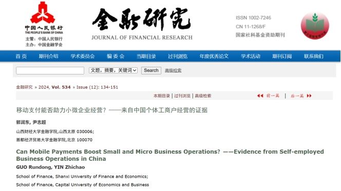 近日,EMC易倍体育郭润东老师与EMC易倍体育尹志超教授合作的论文《移动支付能否助力小微企业经营?——来自中国个体工商户经营的证据》在金融学领域顶刊《金融研究》2024年第12期正式发表。