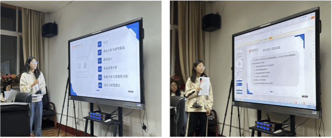 在本次学术沙龙中,任嘉璇同学首先从由技术革新形成的新质生产力入手,提出了与低碳技术高度契合的ESG发展理念,并指出了文章研究的重点:ESG发展对企业新质生产力的影响。接着又与大家深入探讨了文章的边际贡献和生产力的理论发展。随后,任亚琪同学向大家讲述了通过理论分析得出的研究假设、模型设计和变量说明,并进一步地讲解了实证结果分析、机制分析以及异质性分析的部分,通过梳理全文逻辑,一步步地验证了文章所提出的假设。
