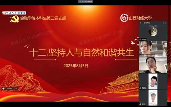 内容:本次会议,本科生第三党支部预备党员张拓通过对“生态文明建设是关系中华民族永续发展的根本大计”、“绿水青山就是金山银山”、“坚持生态惠民、生态利民、生态为民,重点解决损害群众健康的突出环境问题”、“统筹发展和安全是我们党治国理政的一个重大原则”等十一个方面的内容的阐释凸显了“坚持人与自然和谐共生”和“坚决维护国家安全和社会稳定”的重要性,最后由支部成员邱马玥做总结发言。