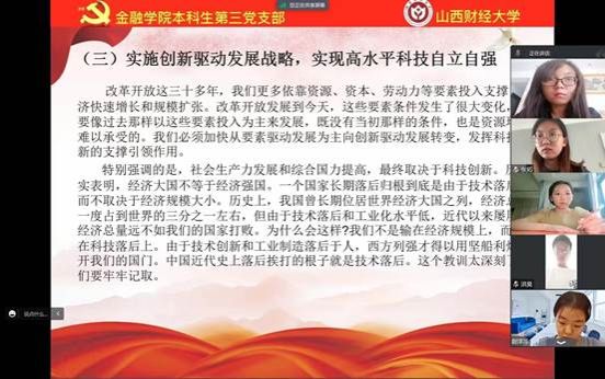 概要:继上次本科生第三党支部预备党员吕琪带领大家学习《推动经济高质量发展》后,在7月22日进行了第六章的学习,本章的主要内容是“实施科教兴国战略,强化现代化建设人才支撑”,本章由本科生第三党支部预备党员万泓滢带领大家学习,本科生第三党支部邱马玥主持并总结发言。