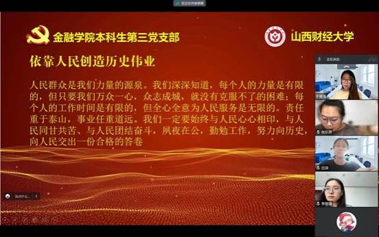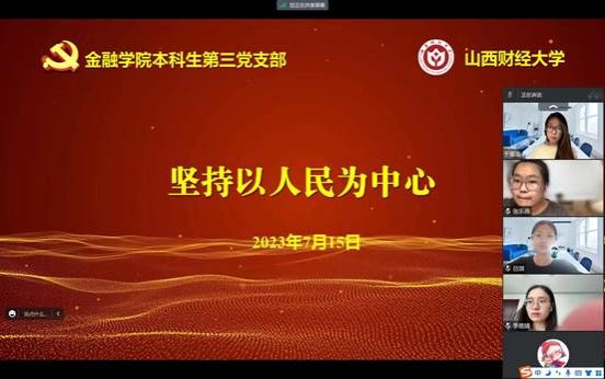 概要:继上次本科生第三党支部预备党员李东营带领大家学习《坚定不移高举中国特色社会主义伟大旗帜》后,在7月15日进行了第四章的学习,本章的主要内容是“坚持以人民为中心”,本章由本科生第三党支部预备党员原红丹带领大家学习,本科生第三党支部邱马玥主持并总结发言。