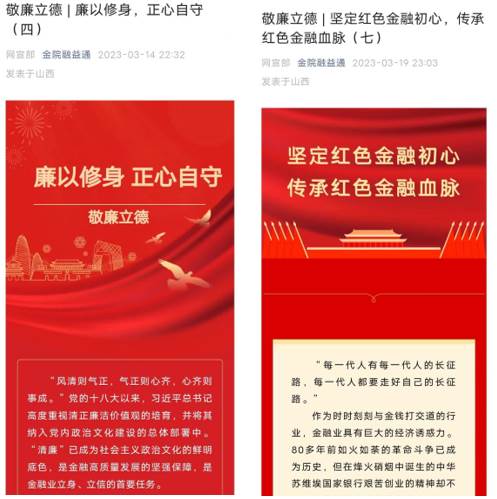 EMC易倍体育充分利用晋商文化资源,从历史遗存、文化经典、文化古迹中挖掘克己奉公、清廉自守的廉洁思想、廉政故事,挖掘晋商精神、金融文化,结合学科特点,提炼廉洁内容,通过师生喜闻乐见的活动内容和形式,让廉洁文化以“更生动、更鲜活、更有效”的方式传播,不断将传承红色基因、培育廉洁意识贯穿到老员工思想政治教育全过程。特别以“互联网”为平台,在公司公众号“金院融益通”开设“敬廉立德”专栏,截止目前累计专题17期,阅读量达2000多,营造了良好的清廉育人环境。