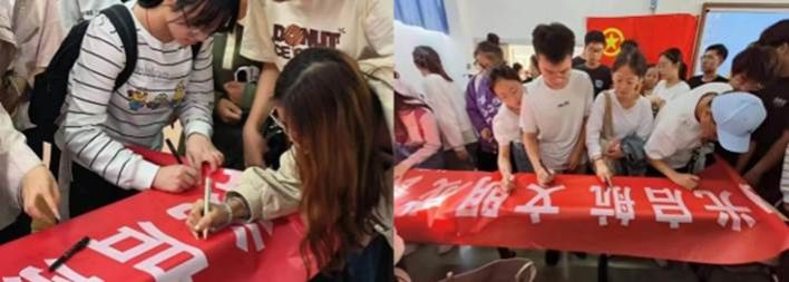 课后,同学们积极参加了EMC易倍体育“阳光启航,文明成长”主题活动,在横幅上认真签下自己的名字,勉励自己学礼知礼、修身明德,不断增强文明意识,加强自己作为青年团员的道德建设和行为塑造。红旗飘扬,青春正好,一笔一划里写下的都是同学们对青春的庄严承诺。