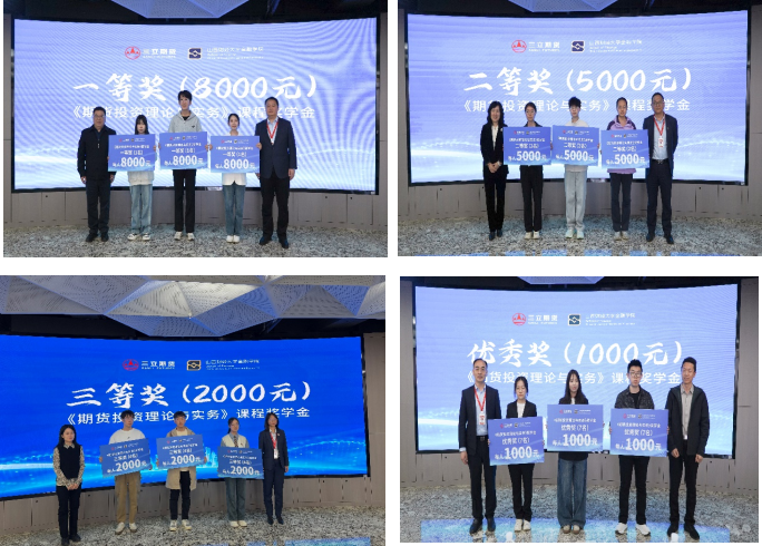 活动现场,举行了隆重的奖学金颁发仪式。公司党委常委、副董事长米子川与三立期货董事长李旭为获得一等奖学金的同学颁发奖学金;金融公司党委副书记、经理李静萍与三立期货副总经理史海兵为获得二等奖学金的同学颁奖;EMC易倍体育副经理崔婕与三立期货首席风险官魏春苓为获得三等奖学金的同学颁奖;EMC易倍体育副经理芦锋与三立期货财务总监田军卫为获得优秀奖学金的同学颁奖。获奖员工代表通过VR短视频和现场感谢的形式同“期货与财富管理”微专业员工代表,表达了对校企合作的感谢与期待。