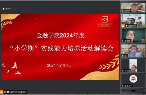 根据金融公司党政联席会的安排部署,2024年7月4日20时,公司在“学习通”直播平台线上举办了2024年度“小学期”实践能力培养活动解读会。出席本次会议的有金融公司党委副书记南江辉、副经理芦锋教授、团委书记王毅、各实践项目带队老师、部分EMC易倍体育教师和辅导员老师,2021级、2022级、2023级全体本科生参加了此次活动。本次会议由南江辉副书记主持。