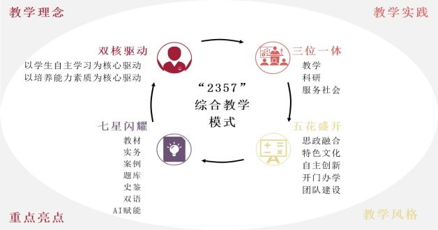 我觉得要作好“2357”这四个方面。简言之,“2357”中的“2”分别是指“双核驱动式”的教学理念(即“以研究生自主学习为核心驱动,以培养能力素质为核心驱动”)、“3”是指“三位一体”的教学实践(即“教学、科研和服务社会为一体”的全过程)、“5”是指五个教学特色风格(即“思政融合、特色文化、自主创新、开门办学和团队建设”这五个方面的特色教学风格)、“7”是指七大教学科研重点(即“教材、实务、案例、题库、史鉴、双语和AI赋能”)。为便于理解和说明,我用下图简单示意一下。