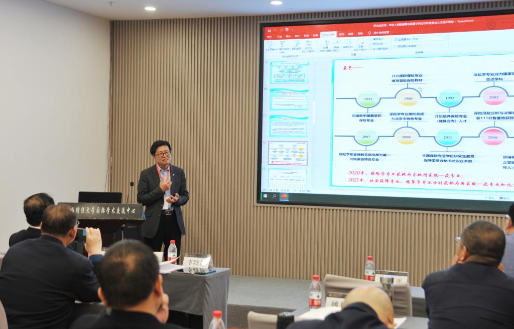 中央财经大学保险公司经理李晓林教授作了关于《对接国家重大发展战略和保险行业发展关键人才需求,做好保险专业学位研究生教育工作》的主题发言。李教授指出:我国保险专硕教育面临的问题主要是保险专硕教育培养的员工质量和社会需求存在一定的差距;目前公司的核心困难是缺乏双师型的团队队伍;我国保险专硕教育下一阶段的评估体系重点突出了公司与行业的关系。李教授还详细介绍了中央财经大学金融专硕和保险专硕的课程体系和实验室建设。