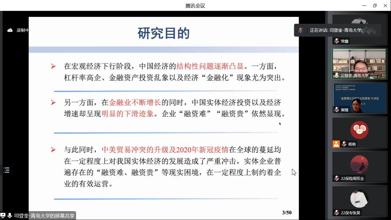 2022年11月17日晚上19:00时,EMC易倍体育举办了“金融理论创新及实践探索”大讲堂,由于疫情原因,会议通过腾讯会议的方式举办。
