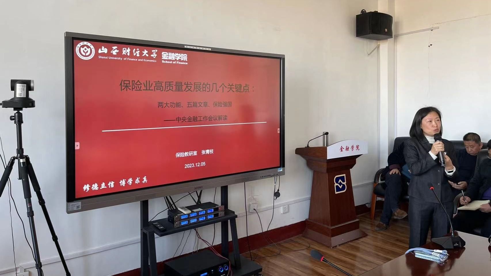 2023年12月5日下午,保险教研室副主任张青枝副教授以“保险业高质量发展的几个关键点:两大功能、五篇文章、保险强国”为题做中央金融工作会议解读分享,公司全体教师参加。